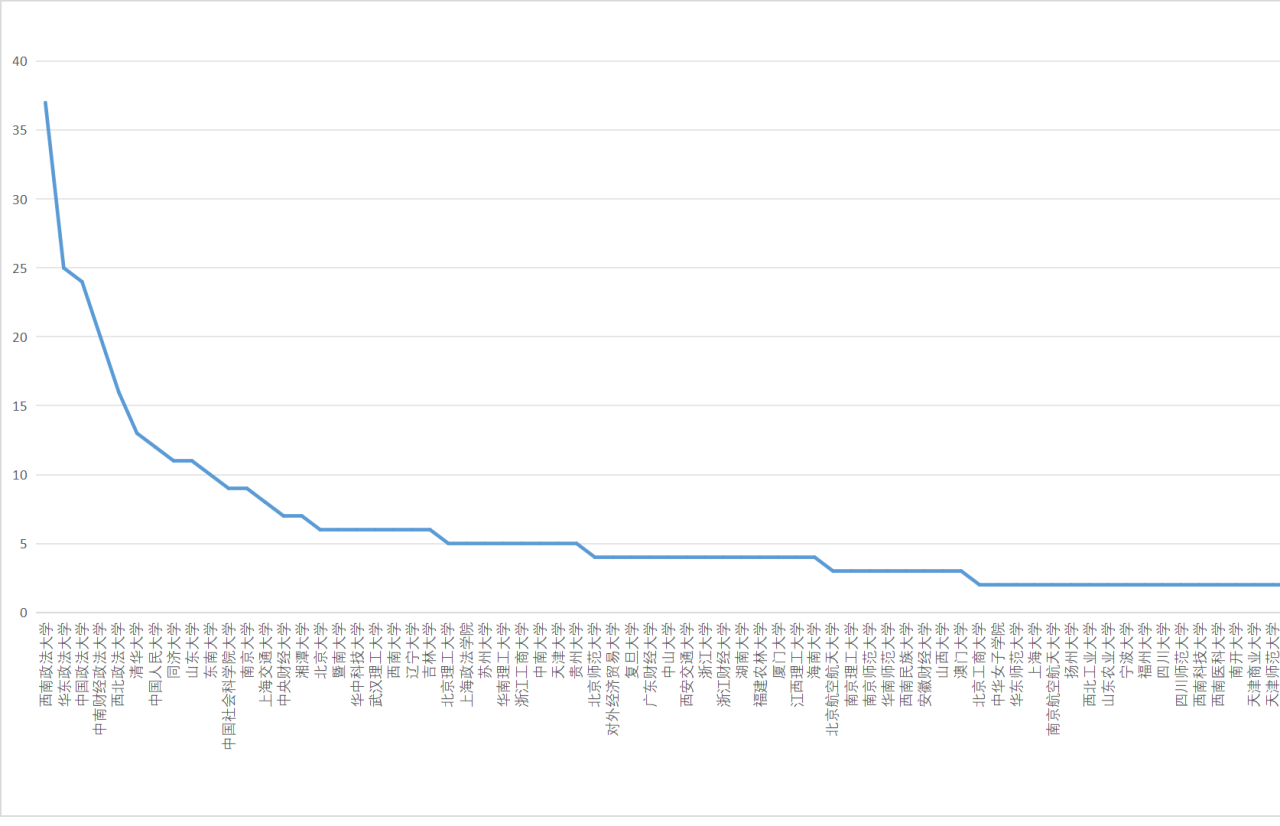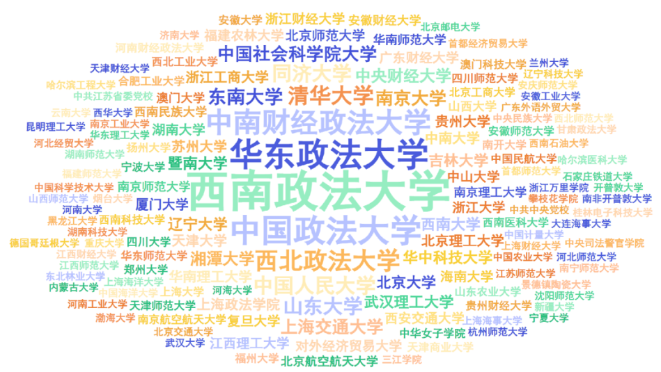 在来稿作者高校中,来稿篇数位于前十高校是:西南政法大学、华东政法大学、中国政法大学、中南财经政法大学、西北政法大学、清华大学、中国人民大学、同济大学、山东大学、东南大学。其中,西南政法大学来稿37份,华东政法大学来稿25份,中国政法大学来稿24份,中南财经政法大学来稿20份,西北政法大学来稿16份。