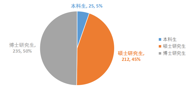 本届研讨会作者在学阶段包括本科生、硕士生和博士生,其中本科生来稿25篇,硕士生来稿212篇,博士生来稿235篇,总体来看以硕博研究生来稿为主,共占比94.70%。