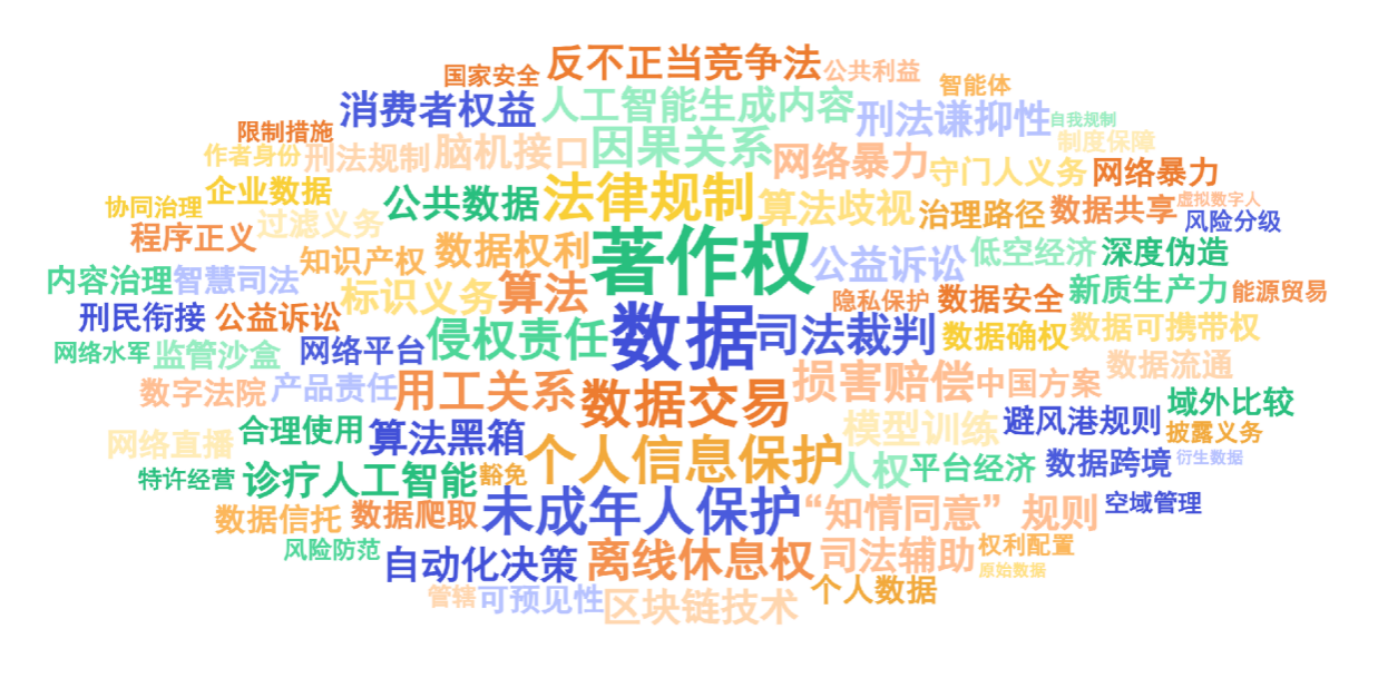 通过对472篇有效稿件关键词词频统计可以发现,“数据”“著作权”“个人信息保护”“人工智能””算法黑箱”等词语在论文关键词中出现频率较高。这些高频词汇与数据制度、知识产权、个人信息、人工智能保护等科技法治前沿问题相呼应。