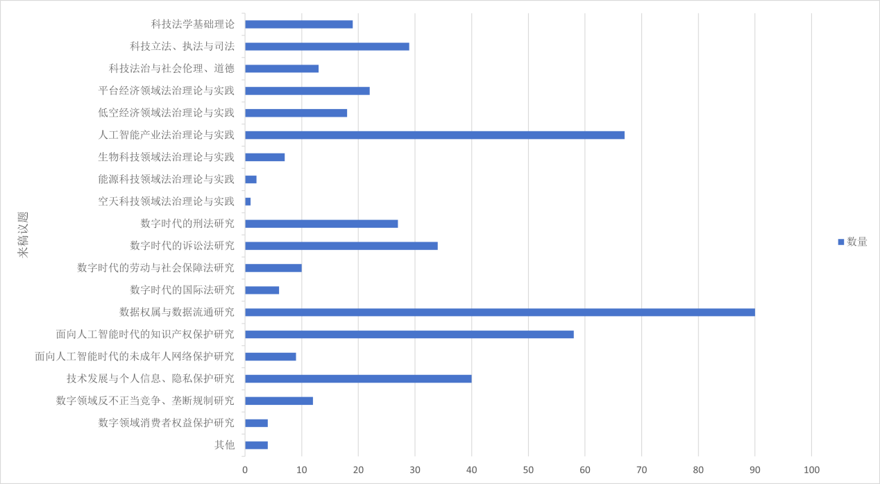 为深入贯彻落实党中央关于实施科教兴国的战略部署和加快发展科技法学的工作要求,深化拓展法学研究新形态,培养高素质复合型科技法学人才,推进科技法学理论与实践的研究与促进学术交流,本届科技法学组委会以“迈向人工智能时代的新科技法学”为主题,提出20个参考议题。来稿文章覆盖20个参考议题,其中“数据权属与数据流通研究”议题来稿数量最多,有90篇,“人工智能产业法治理论与实践”“面向人工智能时代的知识产权保护研究”“技术发展与个人信息、隐私保护研究”三个议题来稿数量也较多,均在40篇以上。