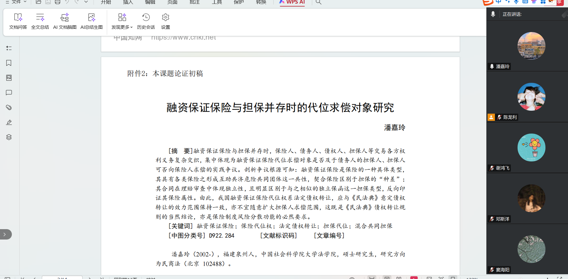 法学院2024级法律(法学)专业硕士研究生潘嘉玲,以“融资保证保险与担保并存时的代位求偿对象研究”为题展开主题报告,中国社会科学院法学研究所谢鸿飞研究员、窦海阳研究员以线上形式参加了本场学术报告会。