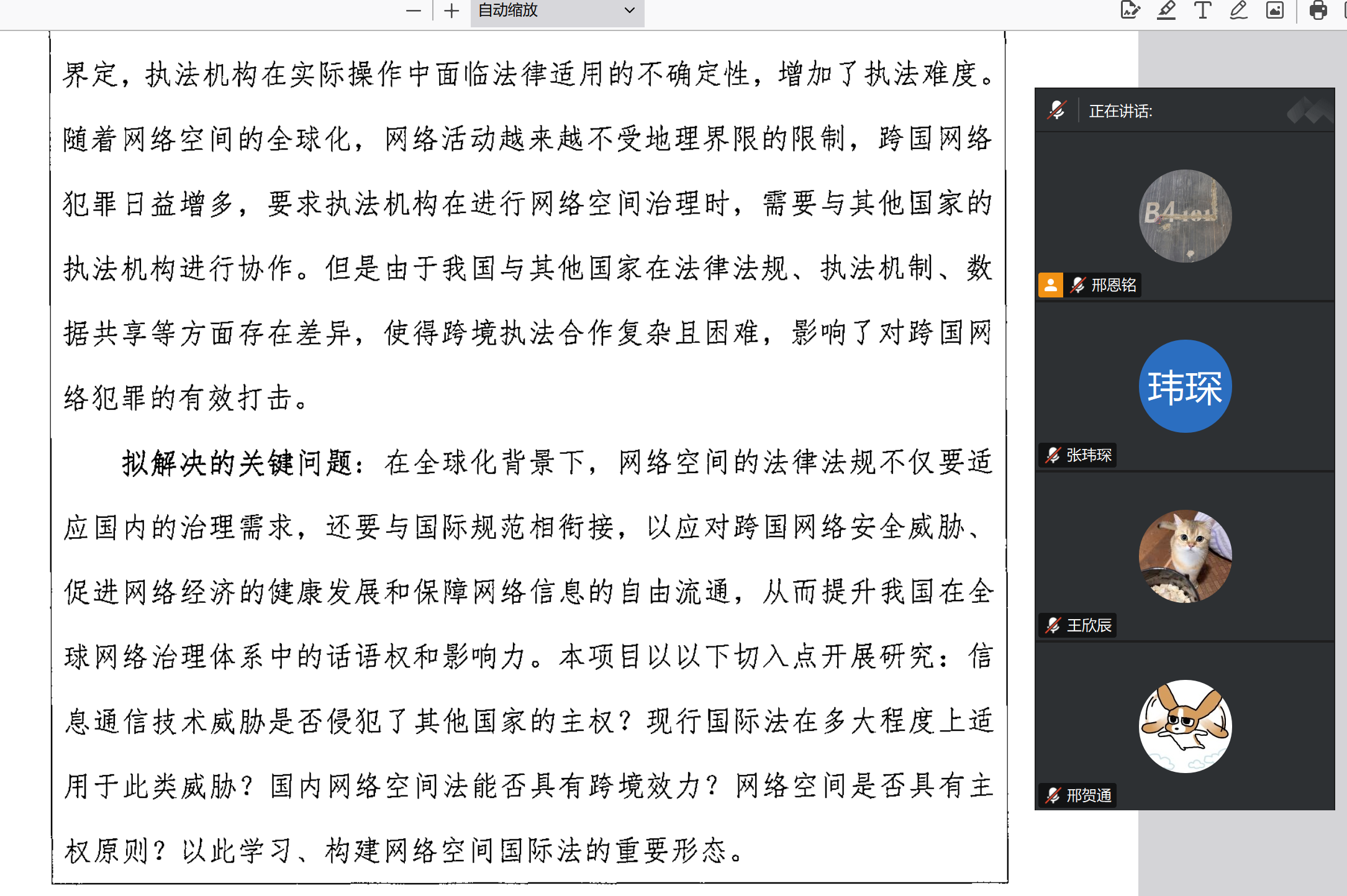 法学院2024级法律(法学)专业硕士研究生邢恩铭,以“网络空间国际法的观念面向与制度研究”为题展开主题报告,河北经贸大学法学院讲师王玮琛、中国政法大学民商经济法学院博士研究生邢贺通与上海交通大学凯原法学院博士研究生王欣辰以线上形式参加了本场学术报告会。