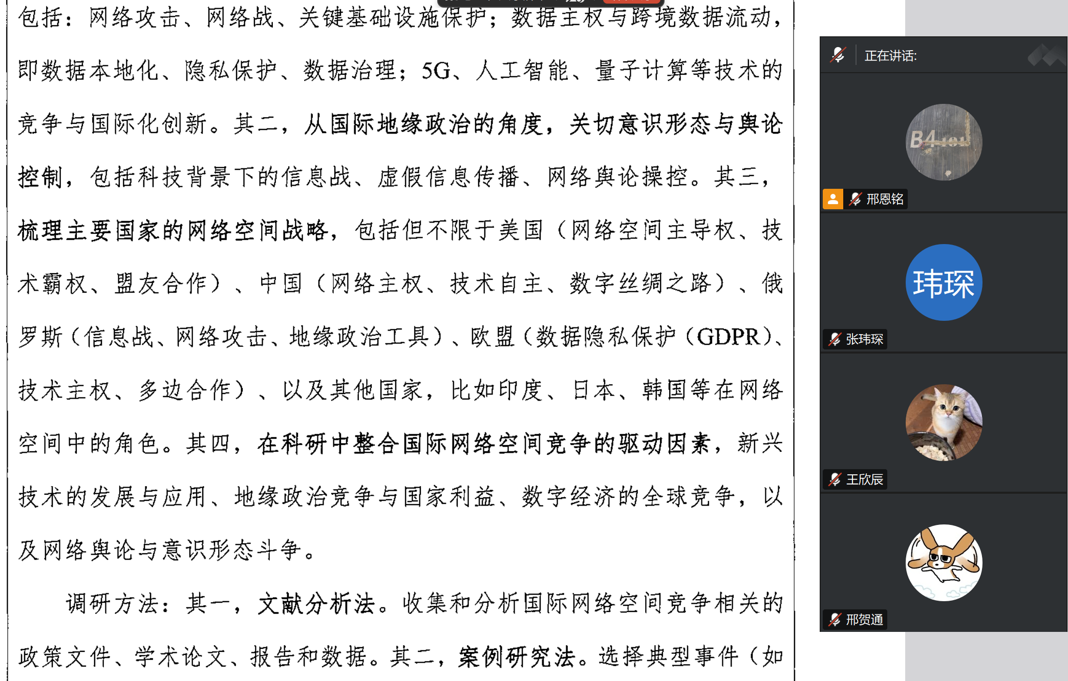 在评议环节,张玮琛老师指出,项目的后期研究不能仅仅停留在国家层面,要看到包括国家、政府间组织、互联网企业、技术社群、公民社会的多方行为体之间的博弈。例如,平台责任问题,本质上是国家主权与私营企业权力之间的冲突;王欣辰认为,论文的结论部分不应只是简单总结,而应提出自己的批判性思考,可以提出在主权国家仍是国际社会主要行为体的当下,“网络空间命运共同体”的理想如何与现实接轨的具体构想;邢贺通认为,问题的总根源,在于网络空间的“技术无国界”与“治理有主权”之间的根本性矛盾。项目成果的每部分分析,最终都应能回溯到这个核心矛盾上来。