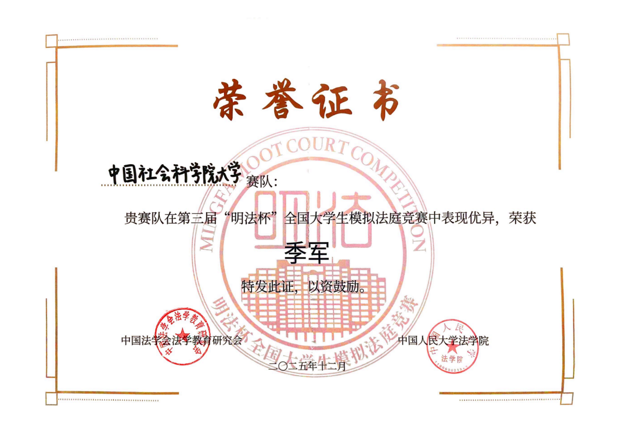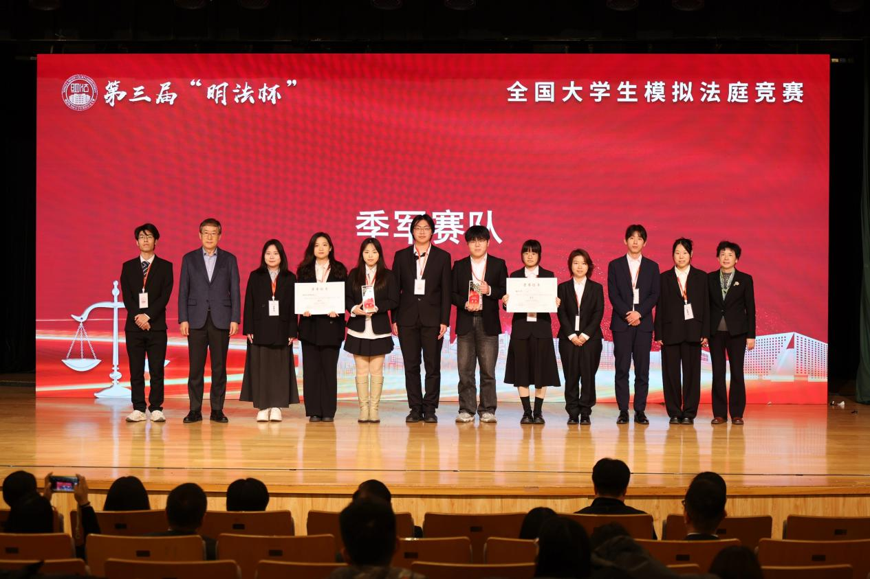 2025年11月至12月,第三届“明法杯”全国大学生模拟法庭竞赛在中国人民大学顺利举行。经过多轮激烈比拼,中国社会科学院大学法学院代表队凭借扎实的专业素养、默契的团队配合与稳健的庭辩表现,以“五轮连胜,一轮惜败”的成绩,成功入围前四强,斩获赛事季军,创下我院在该赛事中的历史最佳成绩。