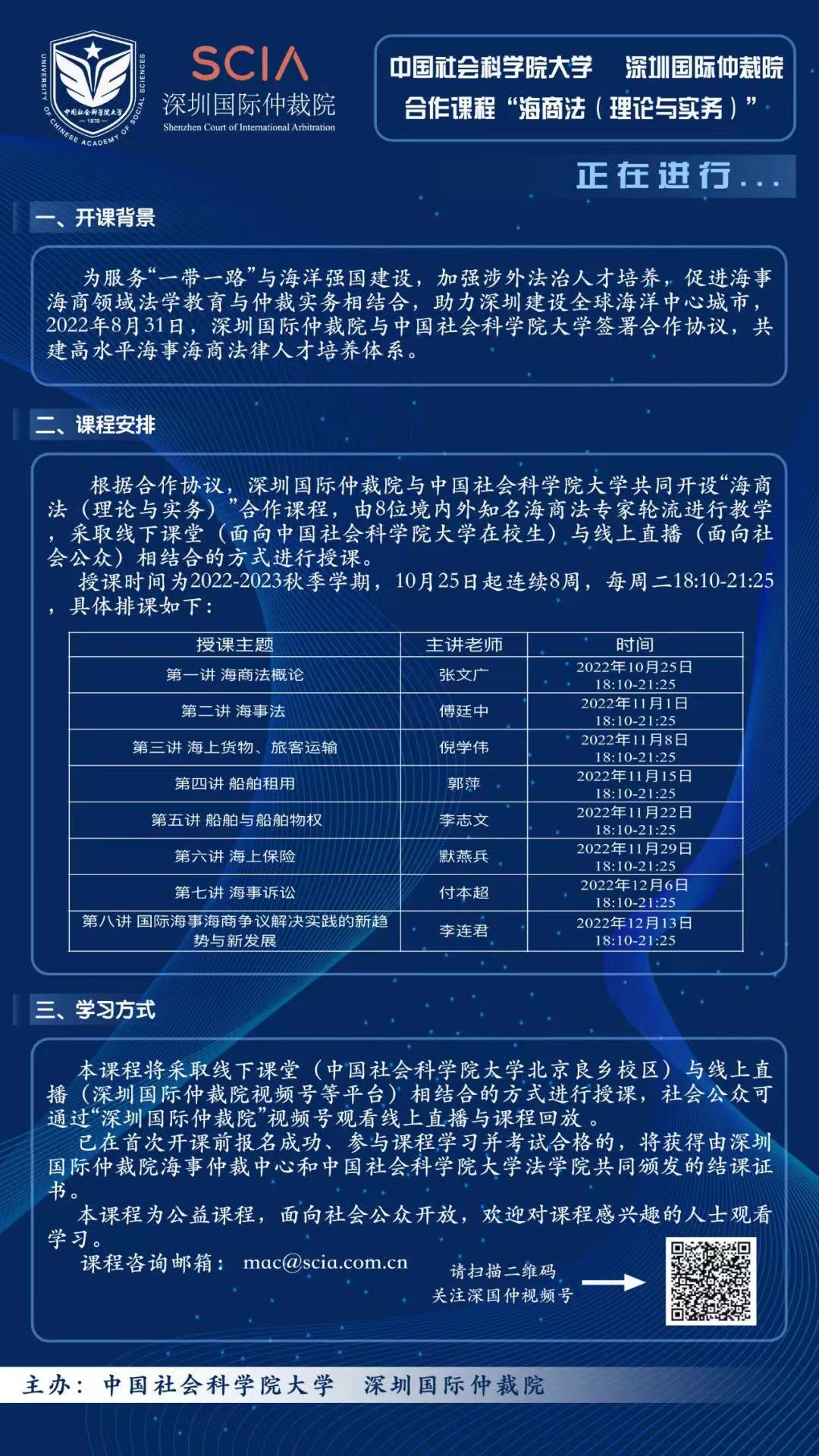 深圳国际仲裁院与中国社会科学院大学合作开设的《海商法(理论与实务)》课程已于2022年10月25日正式开讲。第二讲将由我国著名海商法专家、清华大学教授傅廷中老师主讲,时间为2022年11月1日18:10-21:25。