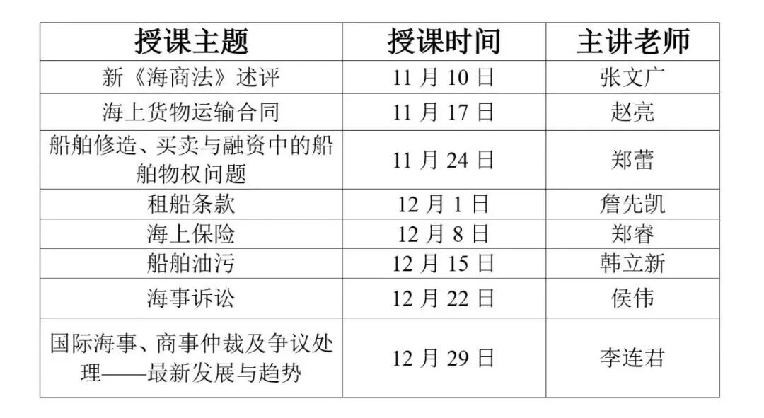 中国社会科学院大学与深圳国际仲裁院共同开设“海商法(理论与实务)”合作课程,由8位知名海商法专家轮流进行教学,采取线下课堂(面向中国社会科学院大学在校生)与线上直播(面向社会公众)相结合的方式进行授课。