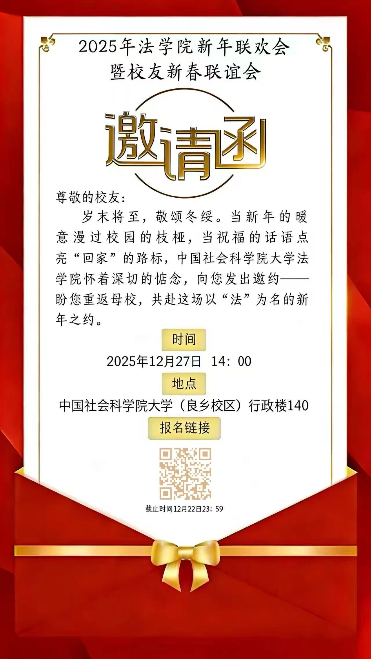 岁末将至,敬颂冬绥。当新年的暖意漫过校园的枝桠,当祝福的话语点亮“回家”的路标,中国社会科学院大学法学院怀着深切的惦念,向您发出邀约——盼您重返母校,共赴这场以“法”为名的新年之约。