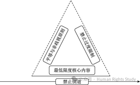 需要说明的是,“实质合理性”的四项具体基准并非彼此平行的关系。在这四项具体的审查基准中,平等与非歧视原则、禁止过度限制以及最低限度核心内容分别为社会权的立法与行政活动框定了三重边界,使社会权的保护范围兼具审查弹性和底线要求;禁止倒退的义务尽管并不构成社会权的具体内涵,但揭示了社会权保护范围在时间维度上的要求(其关系如图1所示)。四项基准的分工与协同构筑了社会权司法审查中的“实质合理性”标准。